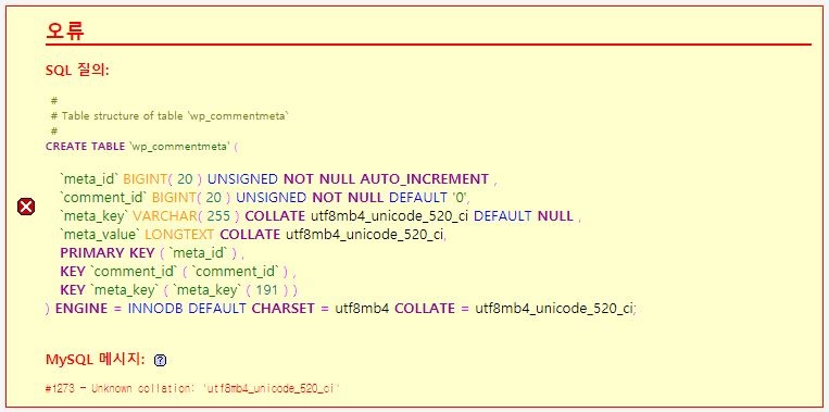 안녕하세요! 이전하려는 MySQL 간 인코딩 버전 호환성 문제로 발생한 오류입니다. http://anothercoffee.net/wordpress-how-to-fix-unknown-collation-error/ 참고가 될 듯 싶습니다. 감사합니다!